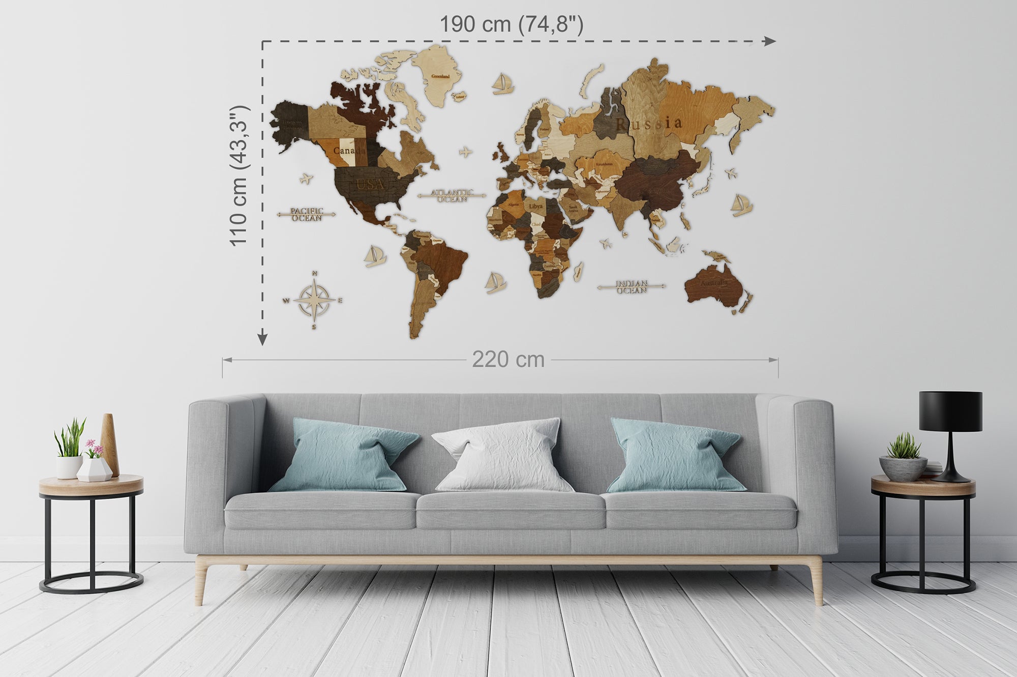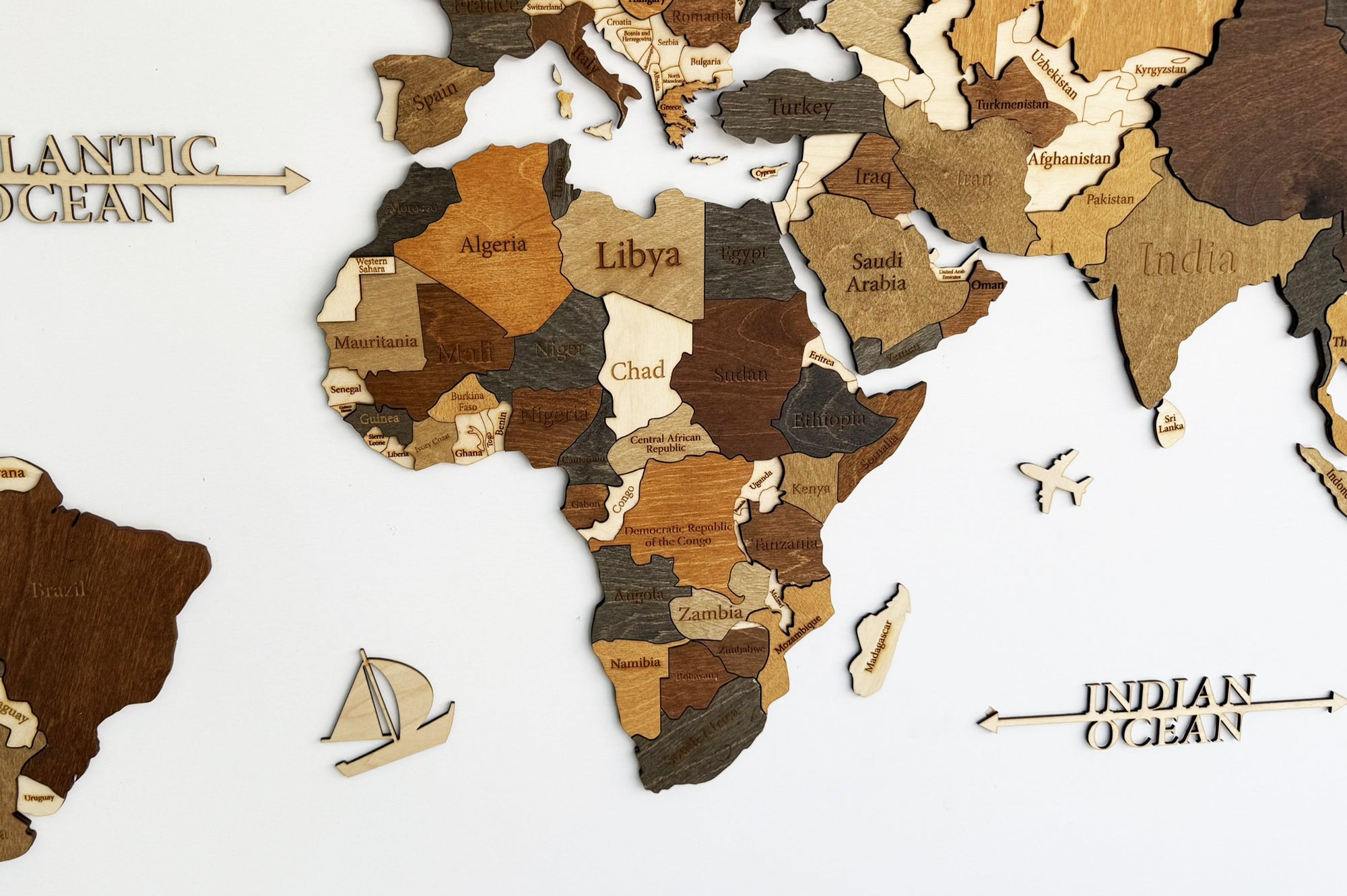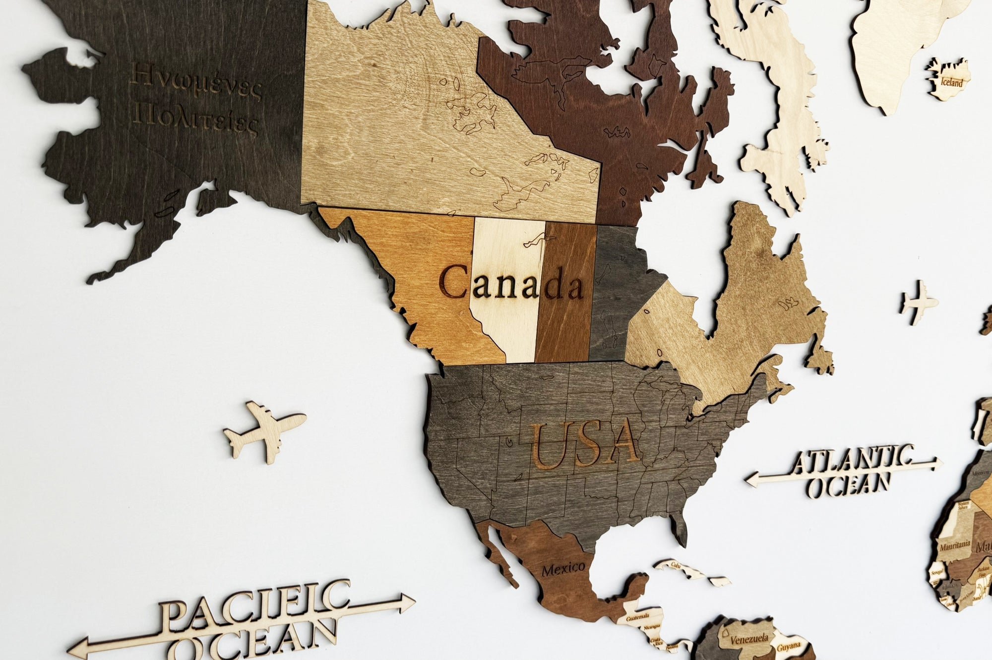 Στον χάρτη θα βρείτε χαραγμένα με laser τα ονόματα των περισσότερων χωρών στα αγγλικά. Επιπλέον διαθέτει διακοσμητικά στοιχεία όπως πυξίδα, καραβάκια, αεροπλάνα, και ονομασίες ωκεανών.